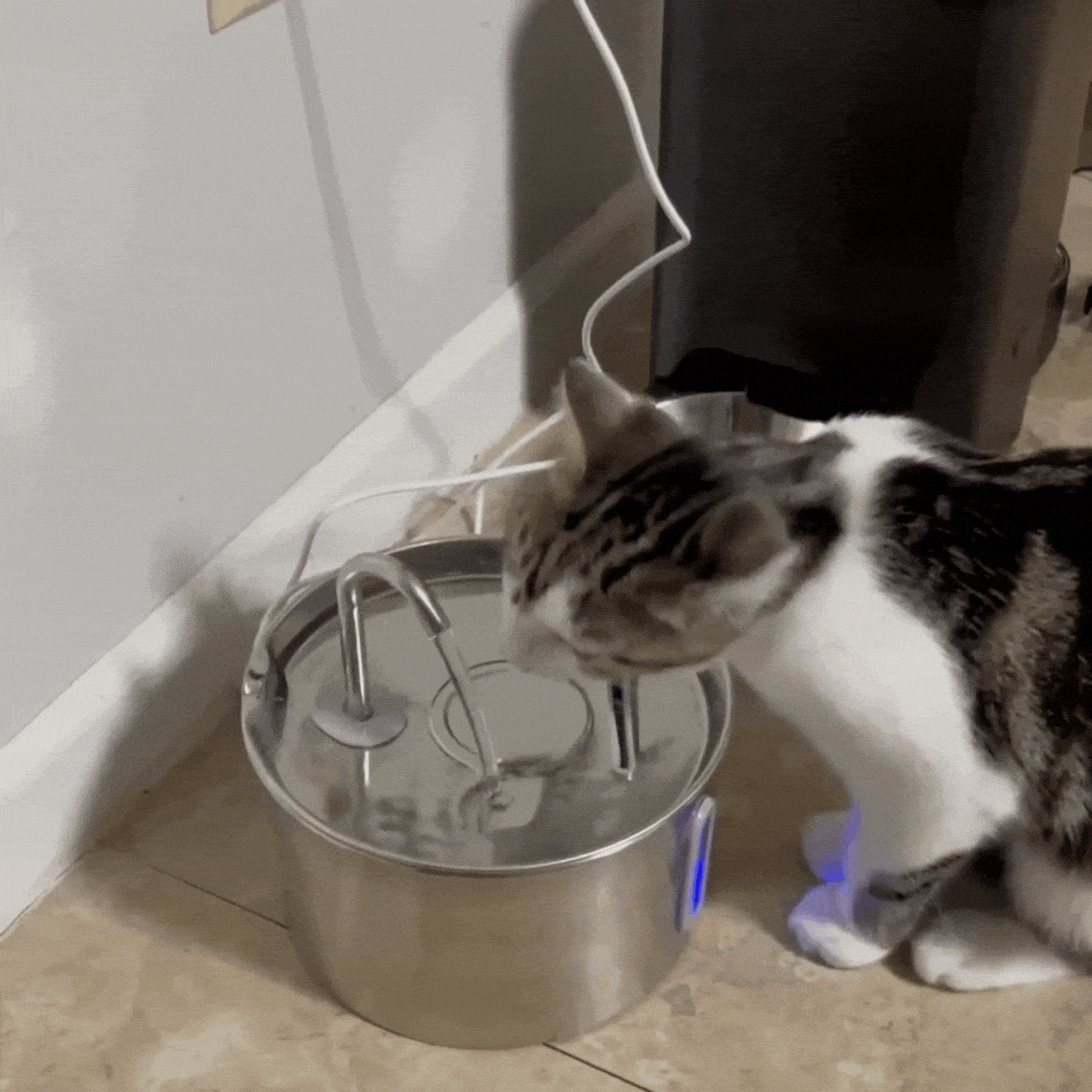 A szökőkút csendesen működik, és nem ijeszti meg a macskáimat. (az előzőnél probléma volt) A víz egész nap friss és tiszta marad. A rozsdamentes acél biztonságosabbnak és könnyebben tisztíthatóbbnak tűnik, mint a műanyag. A macskáim gyakrabban isznak, és a hidratációjuk állandó marad. Megéri megvenni.